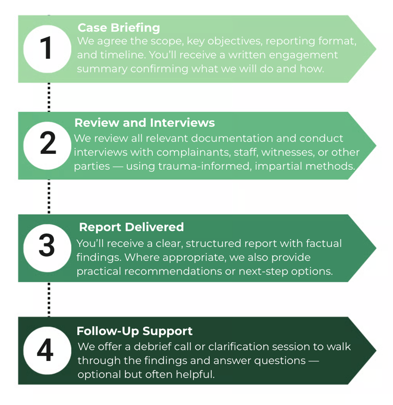 Independent complaint reviews and trauma-informed investigations that protect your people - and your reputation.